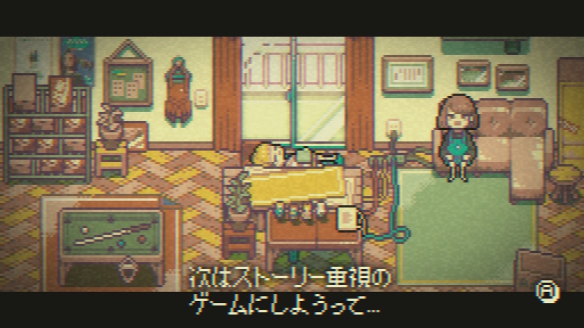 多くのインディゲームでは、作中に蟹井の抱えていたような葛藤や思想が漏れ出していることがままあるが、本作ではそうしたものを極力削ぎ落としてプレイヤーを物語の世界に没入させる。